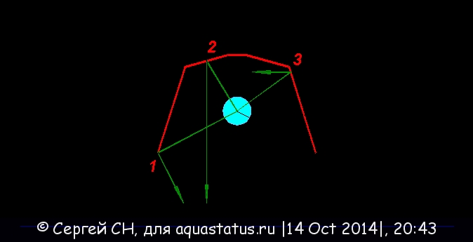 Как было показано выше, форма рефлектора, особенно для одной-двух ламп не имеет принципиального значения, поэтому любая "хорошая" форма будет иметь примерно одинаковую эффективность в пределах 10-15%. Под "хорошей" формой понимается та форма, у которой число отражений не более одного и возврат лучей в лампу минимален. на рисунке предствалено двумерное сечение рефлектора. Видно, что высота рефлектора должна быть такой, чтобы все лучи выше того, который идет от лампы в край аквариума (или другую точку на воде), перехватывались рефлектором. Задавшись примерным направлением отраженного граничного луча (например, вниз или под углом), можно построить перпендикуляр к поверхности рефлектора в этой точке (точка 1 на рисунке). Аналогично определяется перпендикуляр и в точке 2. рекомендуется взять еще несколь точек, для проверки, чтобы не получилась ситуация, изображенная на точке 3, где отраженный луч не идет вниз. После этого можно либо сделать многоугольный каркас, либо построить плавную кривую и по шаблону выгнуть рефлектор. Не следует размещать верхнюю точку рефлектора близко к лампе, поскольку лучи будут попадать обратно в лампу. К тому же лампа будет греться.