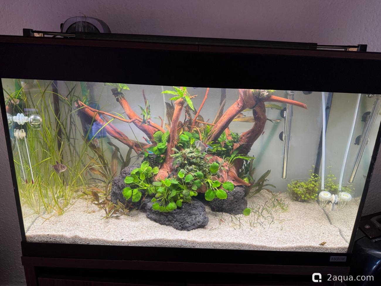 Все это загрузила в аквариум. А так же рыбу и креветок назад в тот же день вечером. Воду я сохранила со старого аквариума. Вечером рыбы вели себя нормально, особо большого стресса не было.