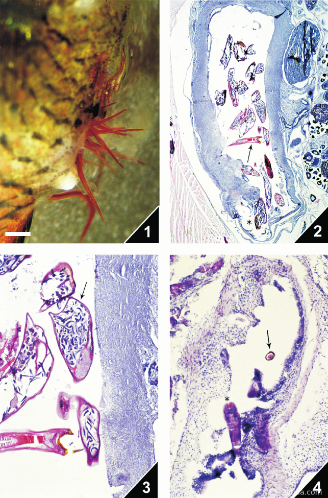 Строение паразита характерно: на головной капсуле находятся кутикулярные выросты, служащие органом фиксации и захвата пищи. Благодаря этим образованиям эту гадкую нематоду легко опознать. Европейские аквариумисты даже прозвали её "cutter block" - "резцовый блок", из-за схожести с фрезой.