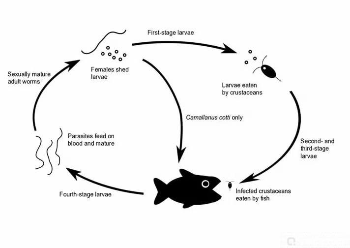 До 70-х годов XX века в отечественных аквариумах этих гельминтов не было вообще. Они появились вместе с импортными рыбами, завезёнными из Азии. В естественных условиях жизненный цикл Camallanus включает промежуточного хозяина (циклопы или личинки насекомых). В аквариуме же паразиты могут обходиться без него, поскольку самки рождают полностью сформированных личинок. Эти личинки некоторое время живут в грунте, а затем попадают в организм рыб вместе с кормом, который те собирают со дна.