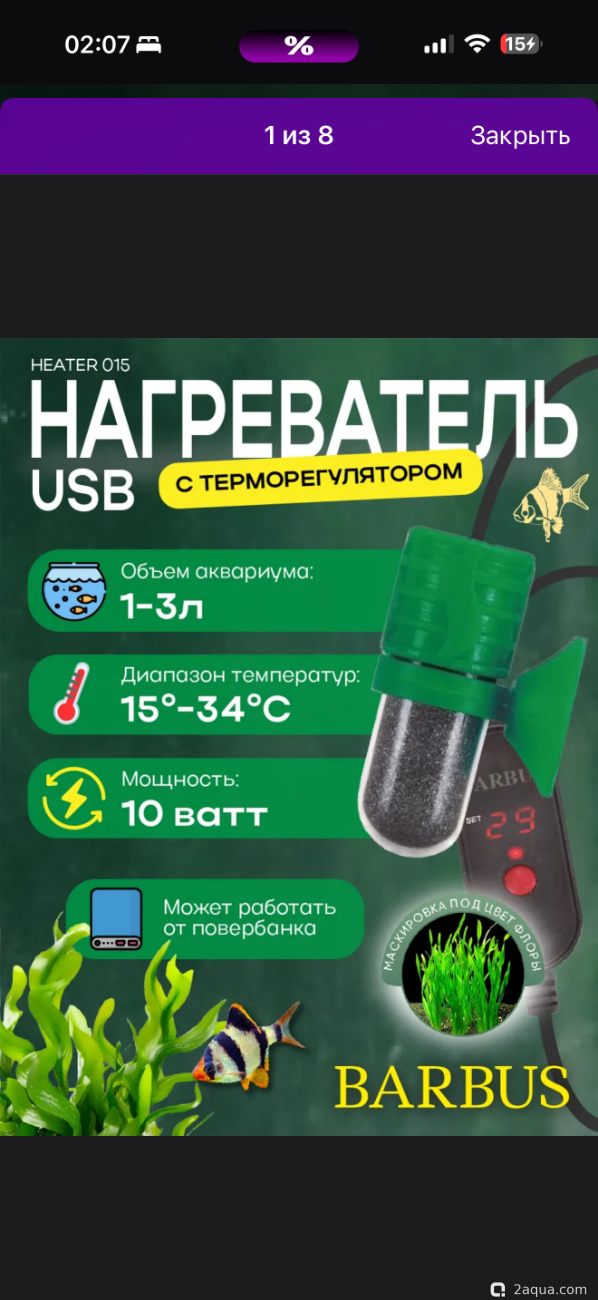 У меня есть барбус с питанием от юсб, но там есть регулятор. Поставила в обычную вилку простую 2а вроде (ну типа не мощную как для современных телефонов), стоит он у меня в 10 литрах с петухом и поддерживает температуру более менее, ниже 26 не опускалась, хотя в комнате временами меньше. Минусов для себя не нашла, разве только это крепление ни о чем, но я заменила на другое