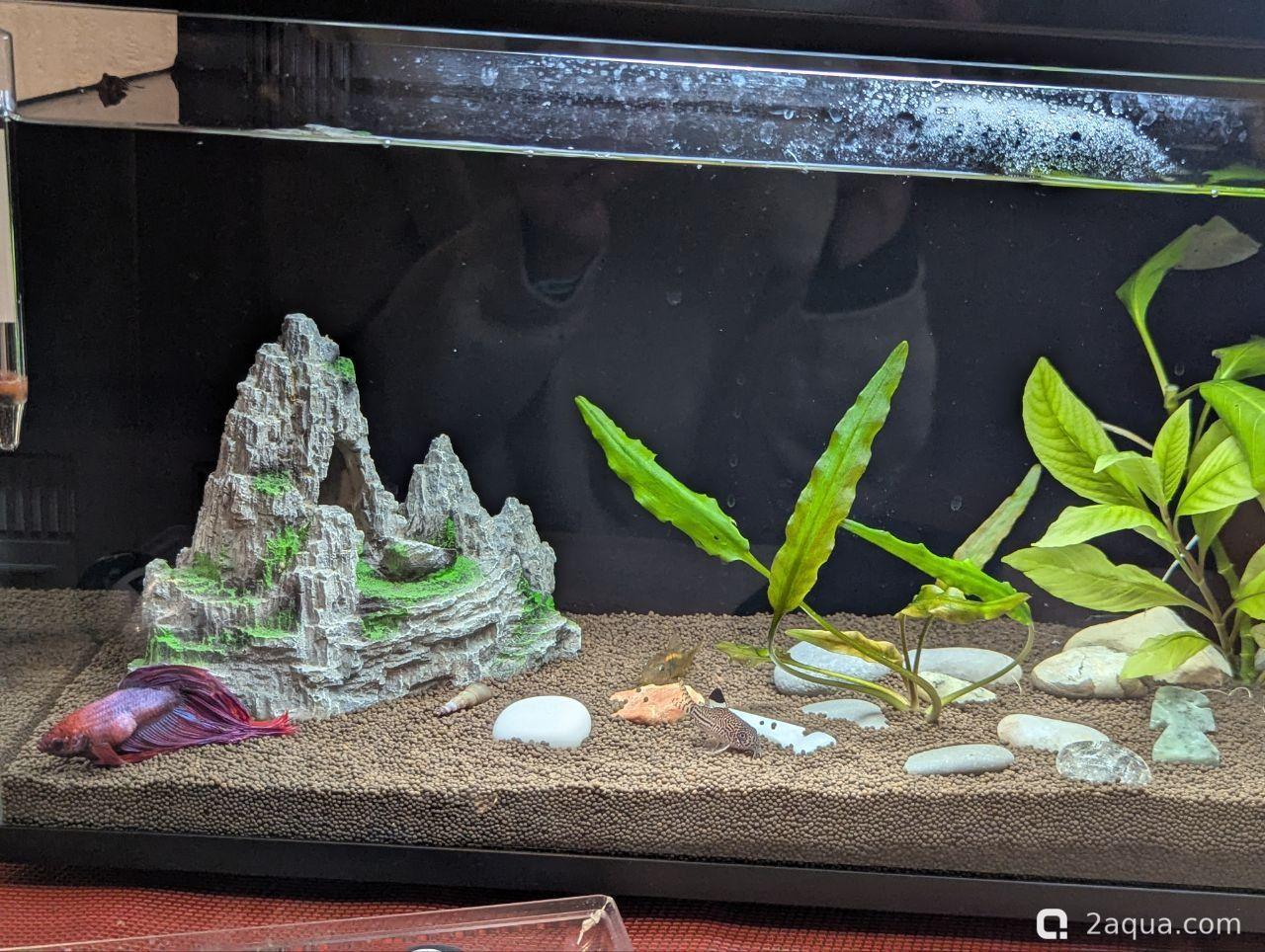 Дата запуска (или перезапуска): был переезд из аквариума 10 литров 05.01.2026 ( но болячка была до этого), первый запуск был весной прошлого года ( в составе петуха 1 шт и коридороса 1шт)